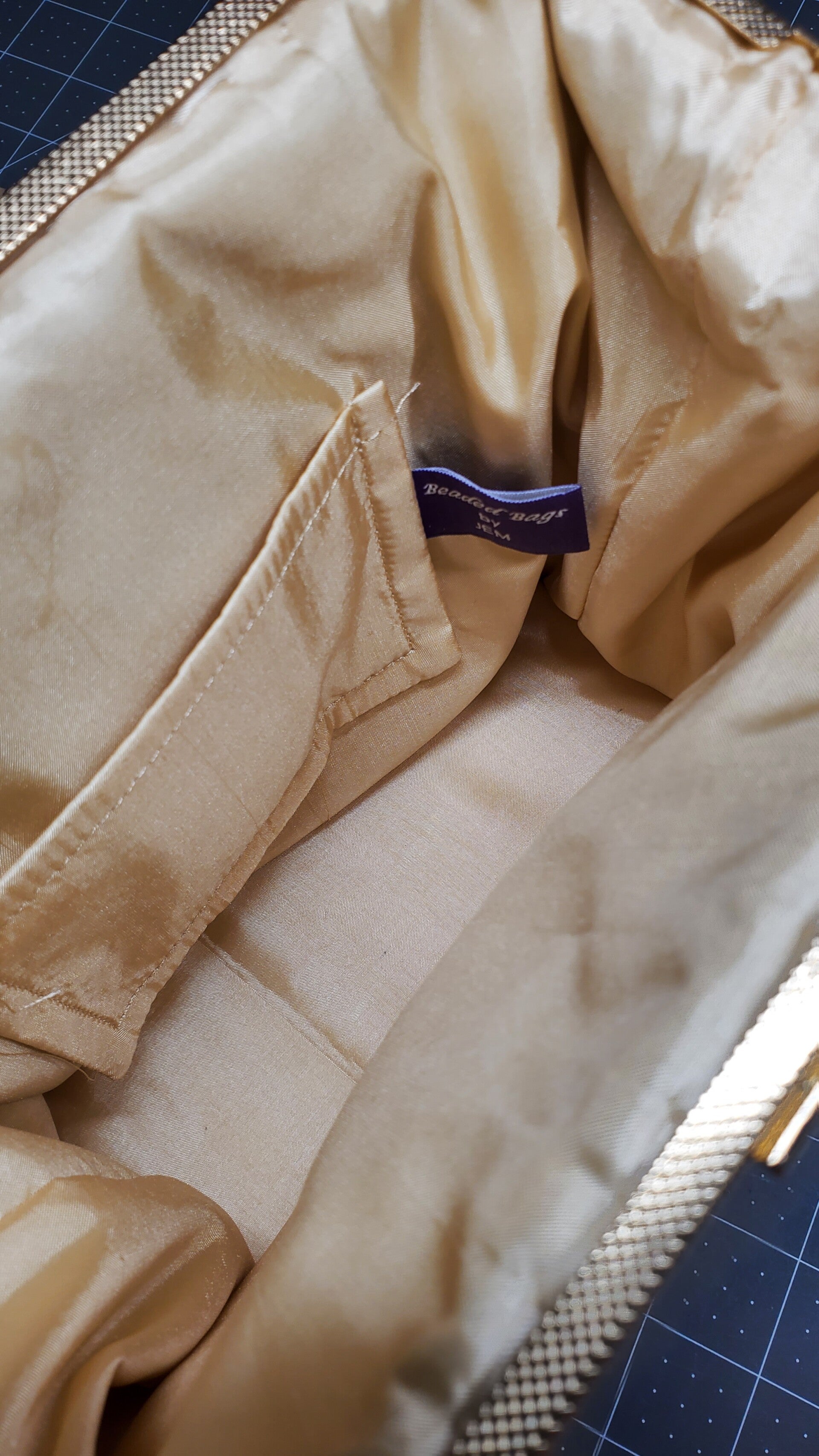 Materials: Acrylic beads with meatl kiss-lock frame. Polyester silk liningwith inside pocket. Dimensions: 8x.5x4x8 inches.
