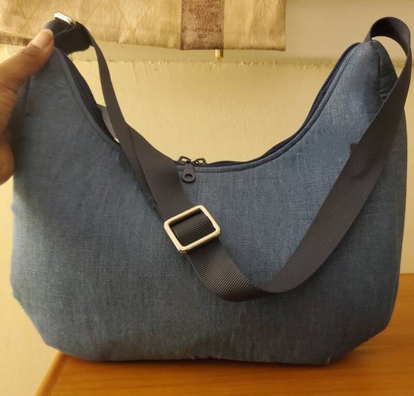 Solid navy, 100% cotton lining. Inside and outer zipper pockket. Double zipper. Nylon adjustable strap. Includes purse charm. Dimensions: 0x0x0 inches.