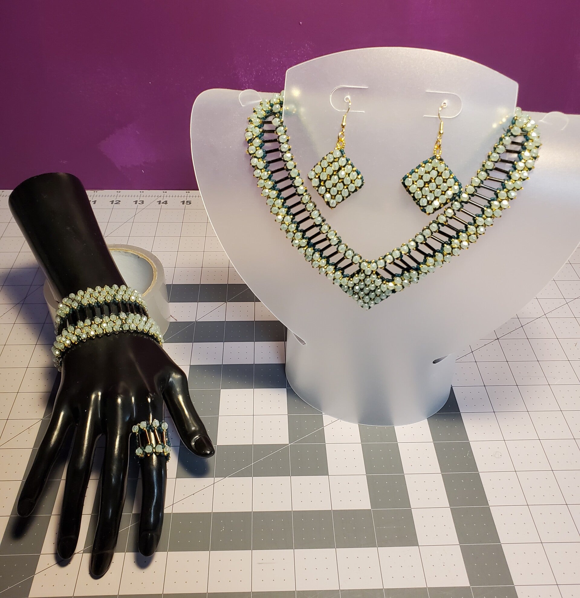 Necklace, bracelet, and earrings. Magnetic clasp.
