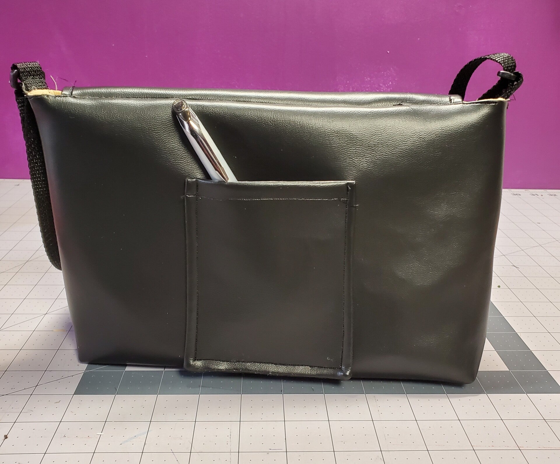 Faux leather. Solid tand polyester lining. 3 long pockets outside. One small pocket on the back. Adjustable strap. Dimensions: 0x0x0 inches. One section.
